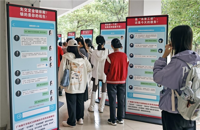 学生们围坐成圈,有人扮演“人事经理”,有人饰演“应聘学生”。这场由广州南方学院联合58同城举办的推理互动游戏,以“看骗局、演骗局、破骗局”为主线,让学生在体验中识别话术陷阱,在共创中形成防骗意识。